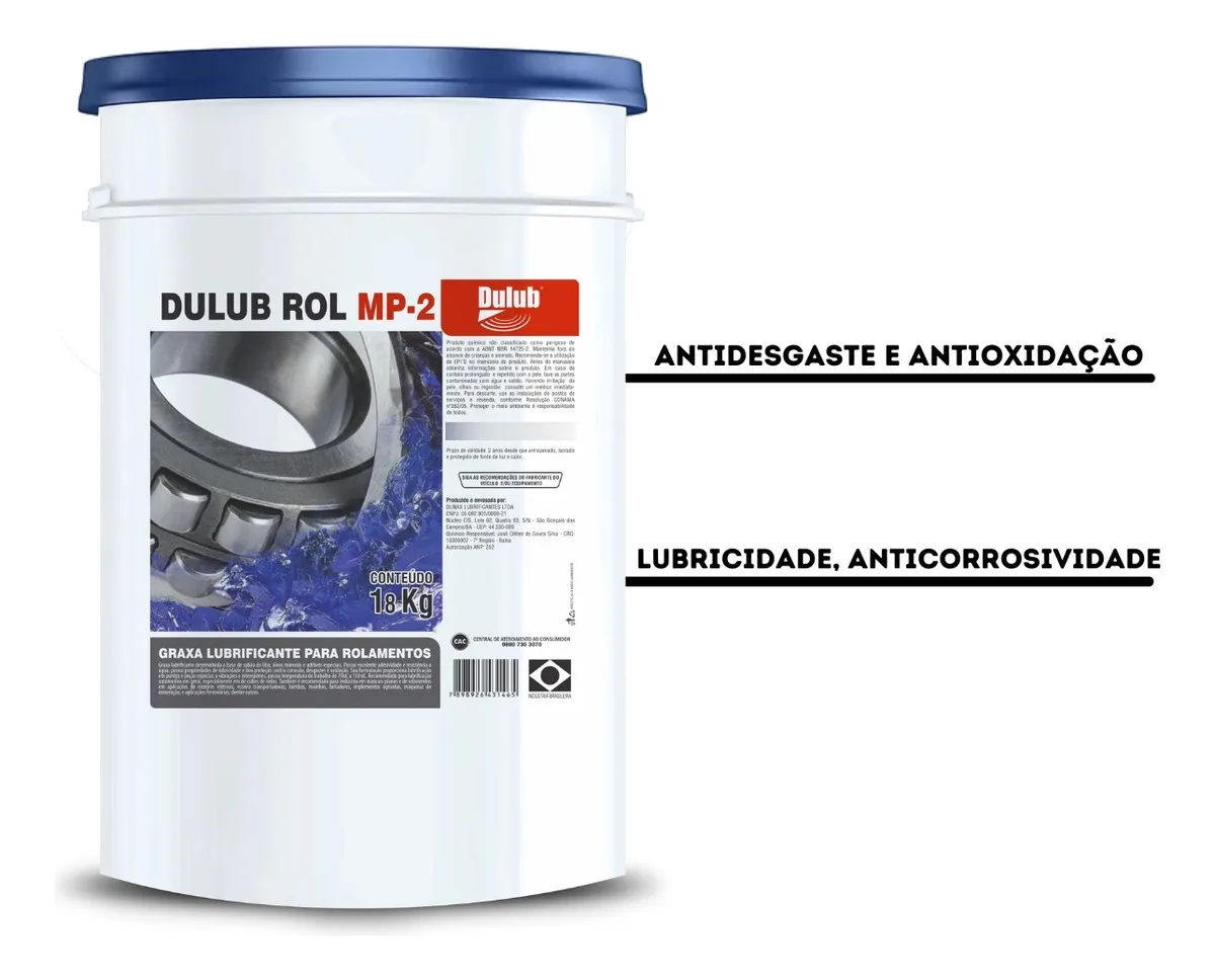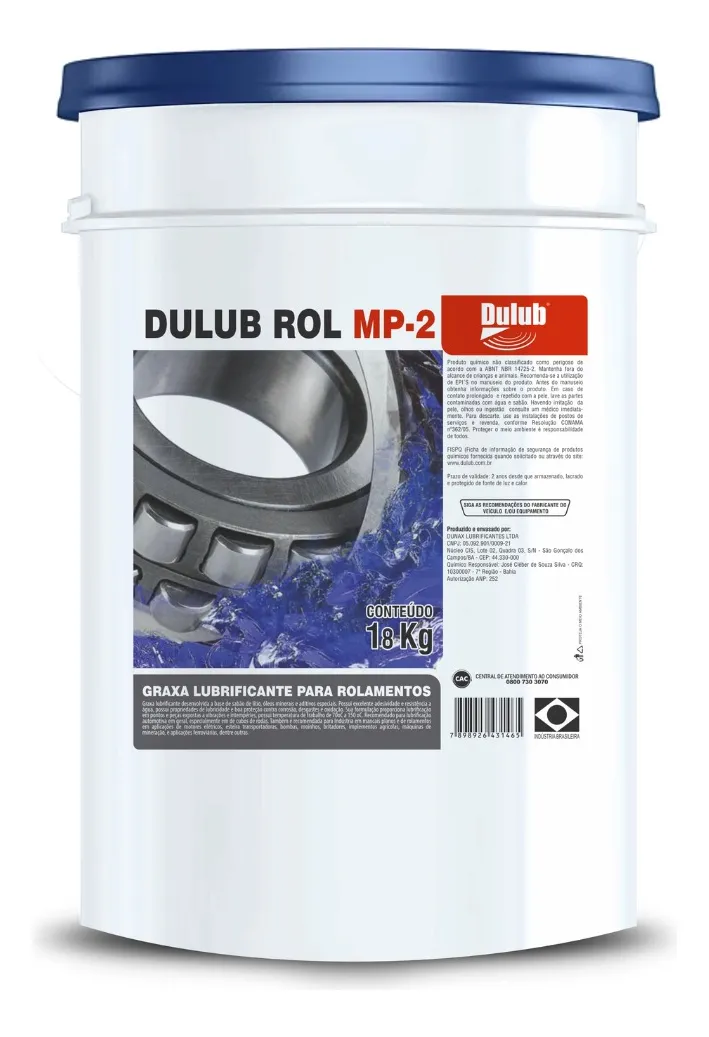 Graxa lubrificante desenvolvida a base de sabão de lítio, óleos minerais e aditivos especiais. Possui excelente adesividade e resistência a água. DULUB ROL MP-2 possui propriedades de lubricidade, anticorrosividade, antidesgaste e antioxidação. Sua formulação proporciona lubrificação em pontos e peças expostas a vibrações e intempéries. DULUB ROL MP-2 possui temperatura de trabalho de 70°C a 150°C. É recomendada para a lubrificação automotiva em geral, especialmente em de cubos de rodas. Também é recomendada para indústria em mancais planos e de rolamentos, em aplicações de motores elétricos, esteira transportadoras, bombas, moinhos, britadores, implementos agrícolas, máquinas de mineração e aplicações rodoviárias, entre outras. DULUB ROL MP-2 possui classificação NLGI 2. Composição química: óleo mineral, sabão de lítio e aditivos.