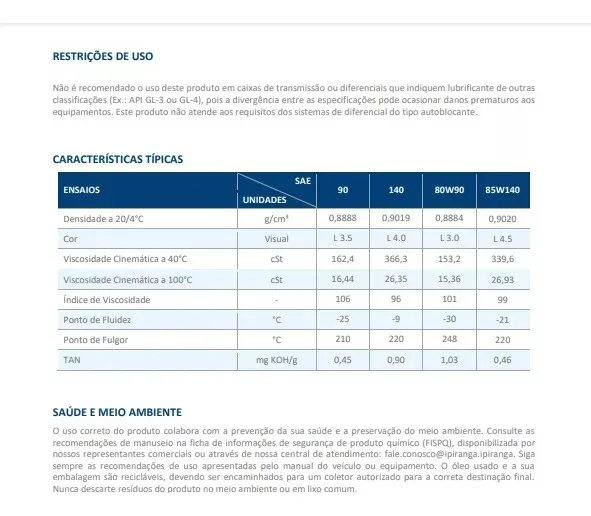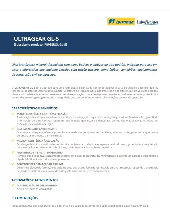 ULTRAGEAR GL-5 foi elaborado com uma formulação balanceada contendo aditivos à base de enxofre e fósforo que lhe fornece a robustez necessária para suportar o esforço de trabalho nos eixos traseiros e nos diferenciais de veículos pesados, oferecendo resistência superior a extrema pressão e proteção contra ferrugem e corrosão. Atua diretamente na proteção dos dentes das engrenagens, garantindo a integridade dos componentes mesmo sob condições severas de operação.